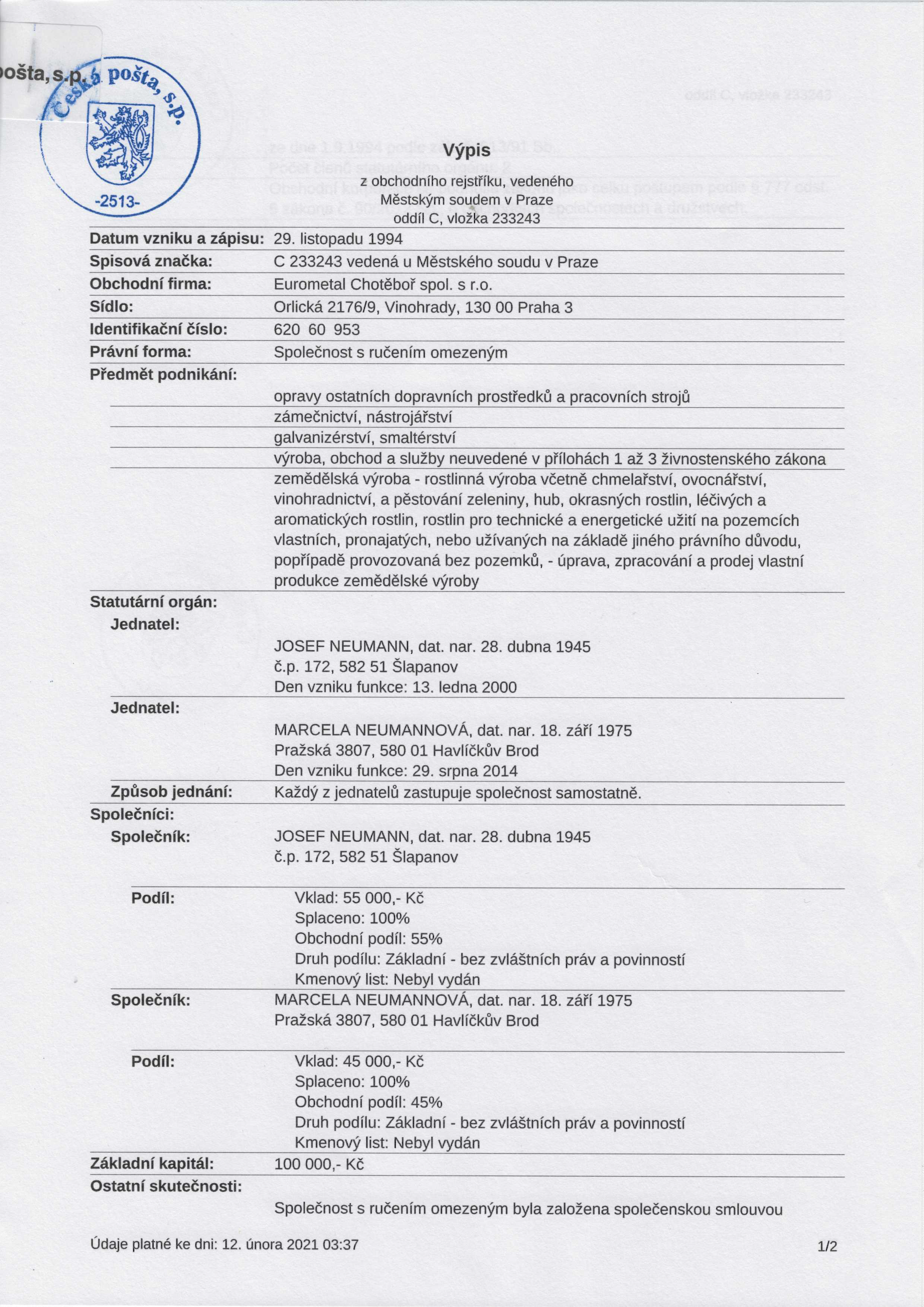 ProvozovnaEurometal Chotěboř spol. s r.o.OTEVÍRACÍ DOBA
